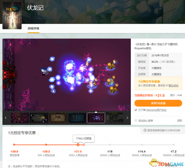 除此之外,另一款国产Roguelike《伏龙记》也在1月25日于WeGame平台正式发售。与此前WeGame上的游戏预售方式相比,这次的《伏龙记》采用了一种非常新奇的形式——由玩家来制定游戏的发售价格。玩家只需在正式发售游戏前,支付一元定金,即可参与此优惠活动。游戏最终的发售价格由参与活动的玩家总数决定,只要参与预订活动的的人数达标,原价36元的《伏龙记》最低7.2元就可以购买。这种玩家提前预付定金拼单的形式,截止至1月24日23点,让《伏龙记》收获近8000套的预售销量,作为一款独立游戏这已是不错的成绩。