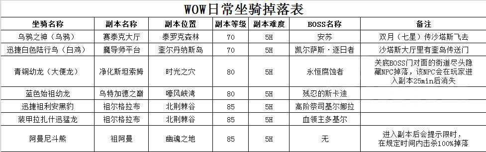 所以我整理了一下从CTM时代到MOP(90级)以来所有掉落坐骑的NPC,希望能帮到各位