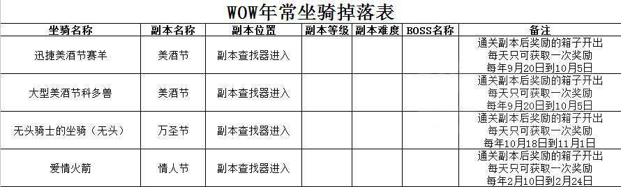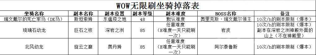 本贴只包括0到90级(不包括德拉诺内容),只包括掉落类坐骑(不包括牌子兑换类)