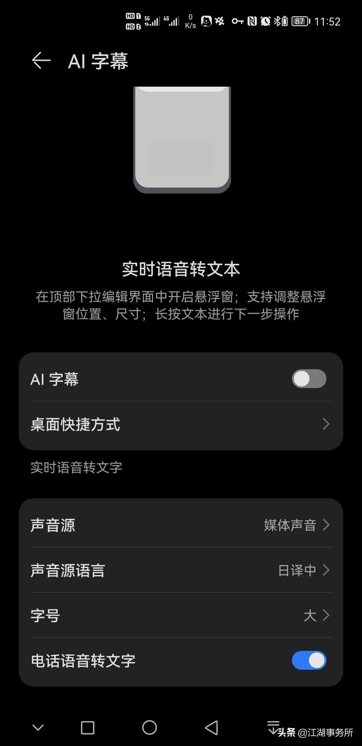 而且声音源并不局限于本机播放,假如你正在电视机上观看日语电影,也可以在手机上得到实时中文字幕翻译,只需要将声音源设置成手机麦克风。