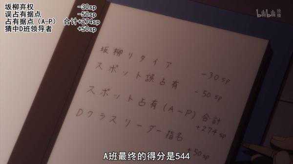 而其他班,被猜中的BD二班排除,A班由于内鬼的存在误操作据点扣去50分,还因为被C班猜中奖励分清零,最终只能获得170分,同时还因为协约内容需要给龙园每个月送上大量点数。